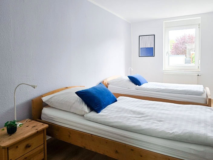Im Eingangsbereich der Unterkunft erwartet Sie ein Flur, über welchen die Küche, das Badezimmer, das Wohnzimmer und ein Schlafzimmer zugänglich sind. Die Küche ist gut ausgestattet und bietet einen Essbereich. Das Badezimmer dieser Ferienwohnung verfügt über eine Dusche, Badewanne, Toilette und Waschtisch. Mit zwei Einzelbetten, Nachttischen und einem Kleiderschrank ist das Schlafzimmer ausgestattet. Das Wohnzimmer der Ferienwohnung ist zweigeteilt. In der vorderen Hälfte befindet sich ein Esstisch mit Bestuhlung, in der hintern Hälfte ist ein Sofa, zwei Sessel, ein Couchtisch und der Fernseher untergebracht. Von dort aus geht es in das zweite Schlafzimmer, welches mit drei Einzelbetten, Nachtischen und einem großen Kleiderschrank ausgestattet ist. Die beiden Schlafzimmer sind zur Hofseite gelegen.